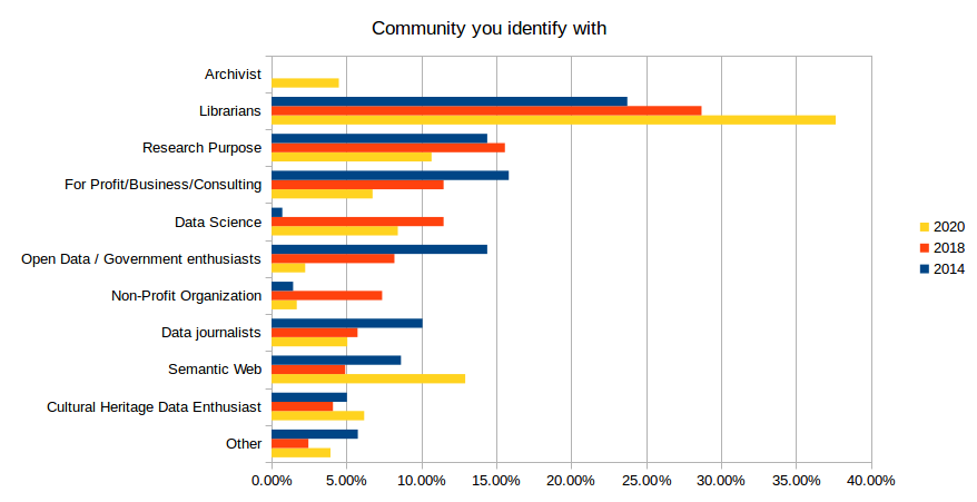 While librarians remain the largest group (37.64%), Wikidata contributor (and semantic web users - 12.92%) made an entry as the second-largest user group in 2020! Researchers now rank third with 10.7% of the user base. Note the community Archivist was not suggested in the answer but still gather 4.49% of the answer!