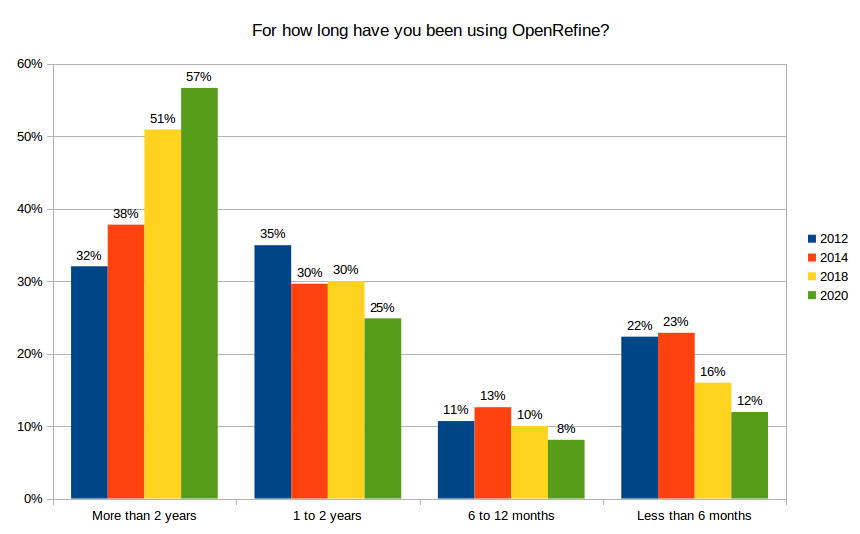 Note that in the below analysis, we included users that never used OpenRefine in the less than six months group (five respondents in 2014, nine in 2018, three in 2020).